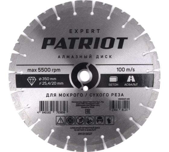 Диск алмазный универс.350*25,4/20 сегментный PATRIOT Бетон/Асфальт