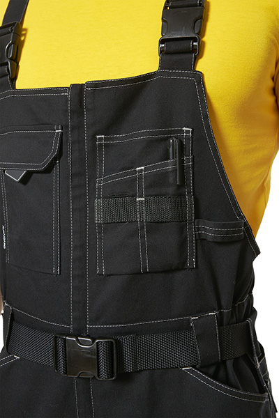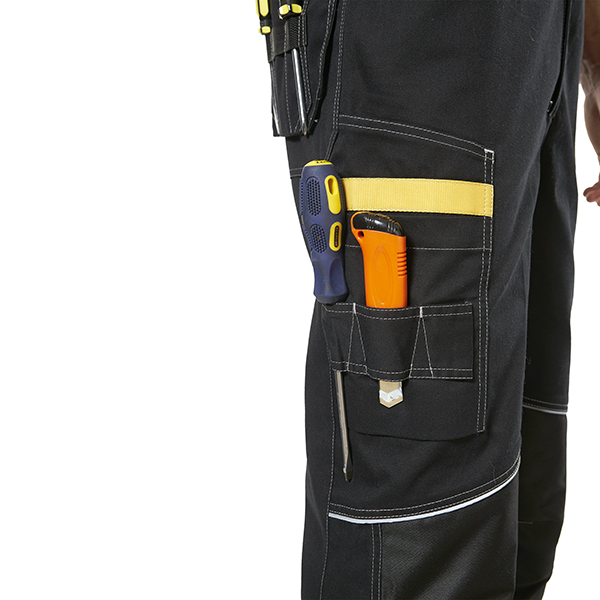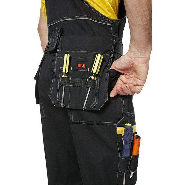 - боковой карман с клапаном спереди с отделом на молнии для мелких деталей, боковой карман сзади для инструментов, верхние передние карманы и задние накладные карманы;