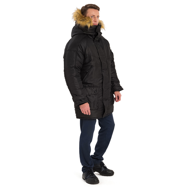 Застежка на двухзамковую молнию и ветрозащитный клапан. Капюшон со съемной опушкой из искусственного меха (енот) стягивается шнуром. Рукава с полушерстяными напульсниками, регулируются по ширине патой. Утепленные флисом нагрудные и боковые объемные карманы, накладной карман на левом рукаве, внутренние карманы, под ветрозащитным клапаном – потайной карман с молнией (для планшета и документов формата А4). Внутренняя ветрозащитная юбка.